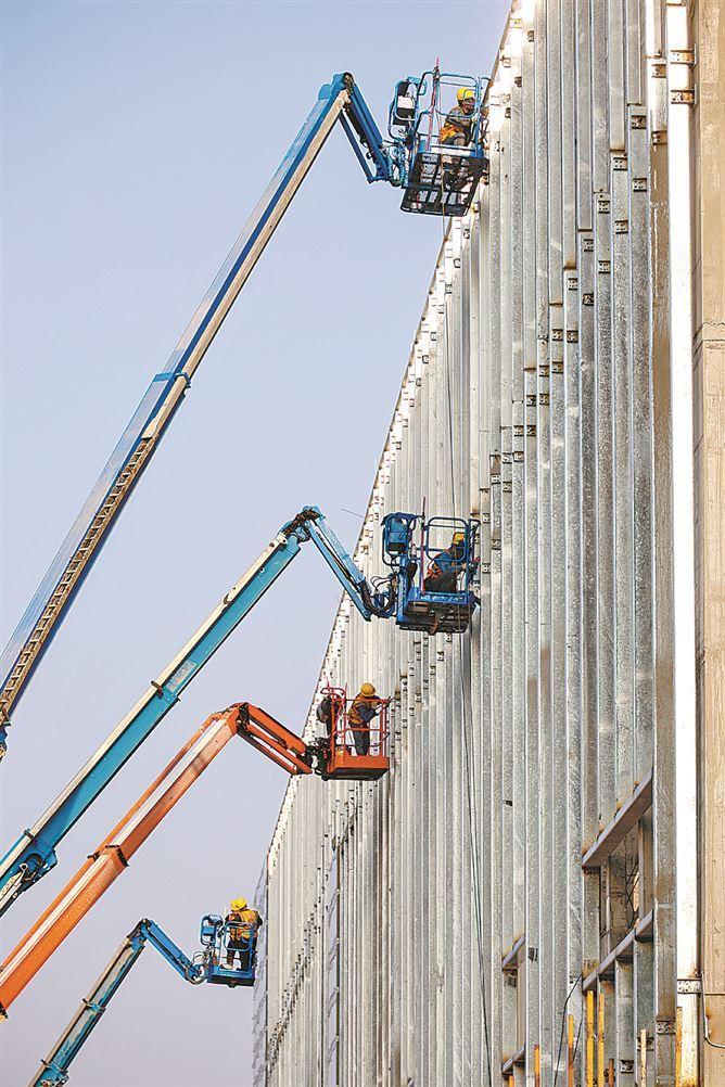 进门左手边,一栋占地颇具规模的厂房格外引人注目。高大的塔吊与6台大型曲臂升降车搭建起壮观的作业矩阵。头戴安全帽、身穿荧光背心的工人们站在十几米高的车斗上作业。“他们要先给外墙焊上钢架,再装上岩棉夹芯板,最后封闭墙板。” 承建方项目负责人杜海明指着外立面幕墙介绍,这种 “三明治” 结构的幕墙,不仅封闭性能优异,还兼具保温、隔热、隔音、防火等多重优势,更能匹配精密厂房的严苛要求。